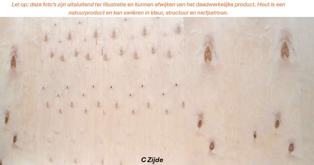 C/C – kwaliteit zonder gerepareerde dek fineren en veel verkleuringen. Geen zichtwerk maar gebruik vanwege constructieve / sterkte eigenschappen. Platen standaard ongeschuurd.